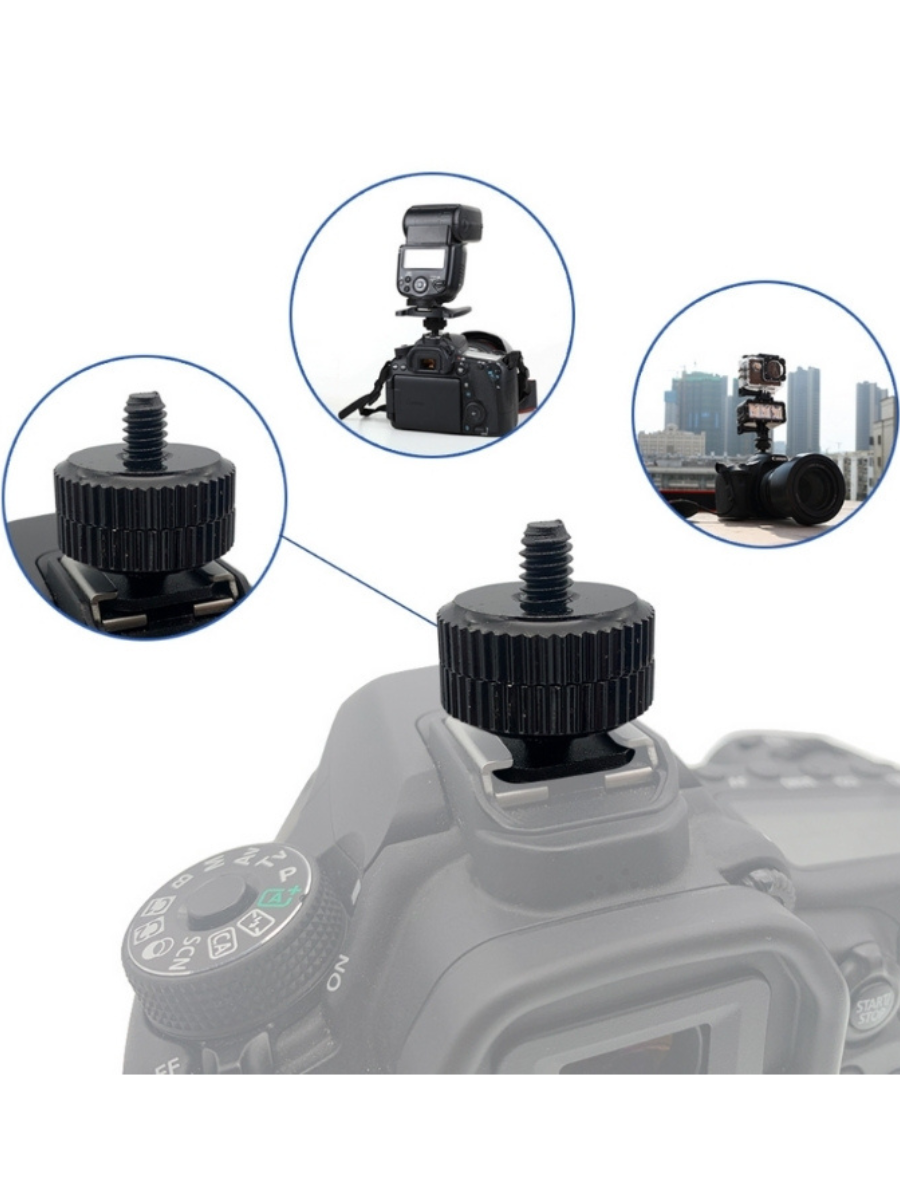 Металлический переходник-адаптер на горячий башмак с двумя блокировочными гайками. Позволяет крепить дополнительное оборудование с резьбой 1/4 дюйма на горячий башмак фотокамеры. Это может быть монитор, вторая фотокамера, LED свет или любое другое оборудование с резьбой 1/4 дюйма.
