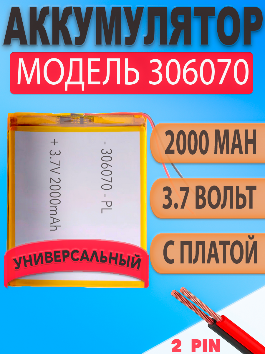 Аккумулятор (батарея) 306070 2000mah 3,7v (70х60х3 мм)